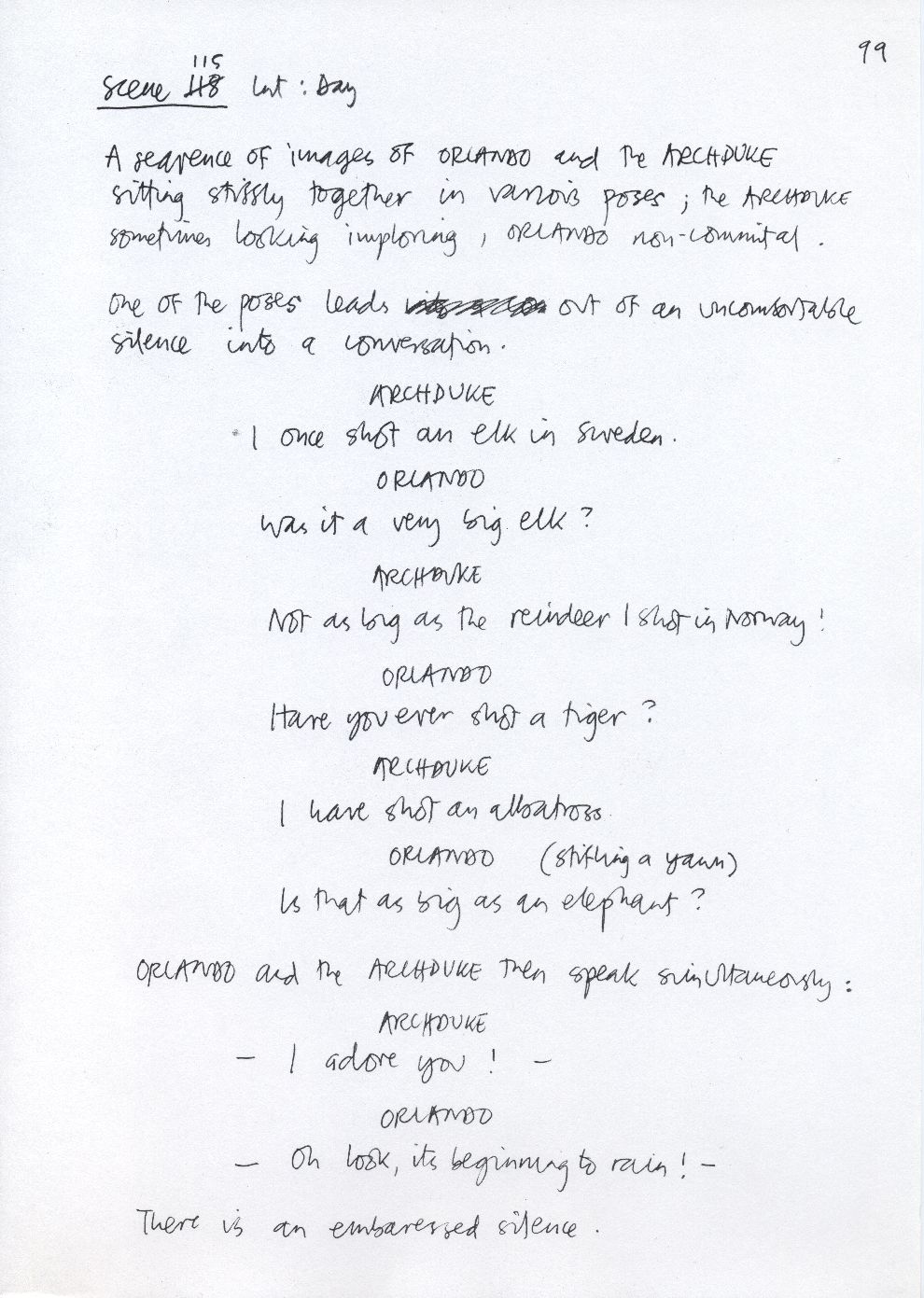 Description Page 99 of rough draft of scene 115. Hand written in black ink with pen annotations.
