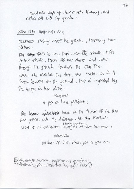 Description Page 114 of rough draft of scene 123, scene 124. Hand written in black ink with pen annotations.