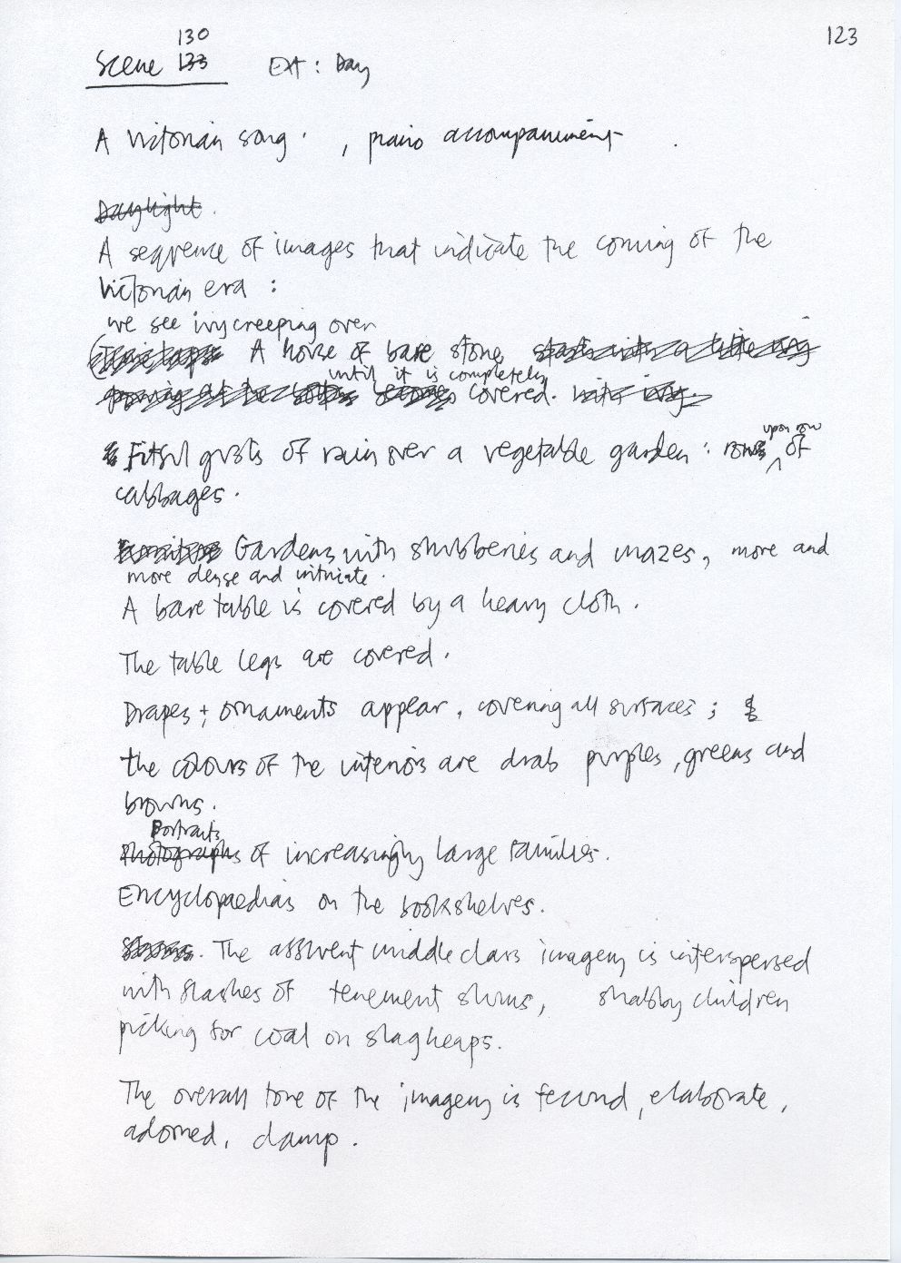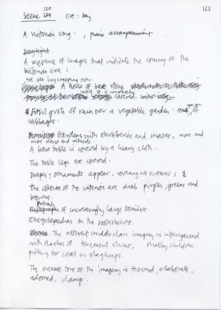 Description Page 123 of rough draft of scene 130. Hand written in black ink with pen annotations.