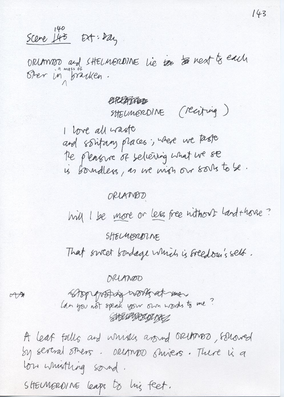 Description Page 143 of rough draft of scene 140. Hand written in black ink with pen annotations.