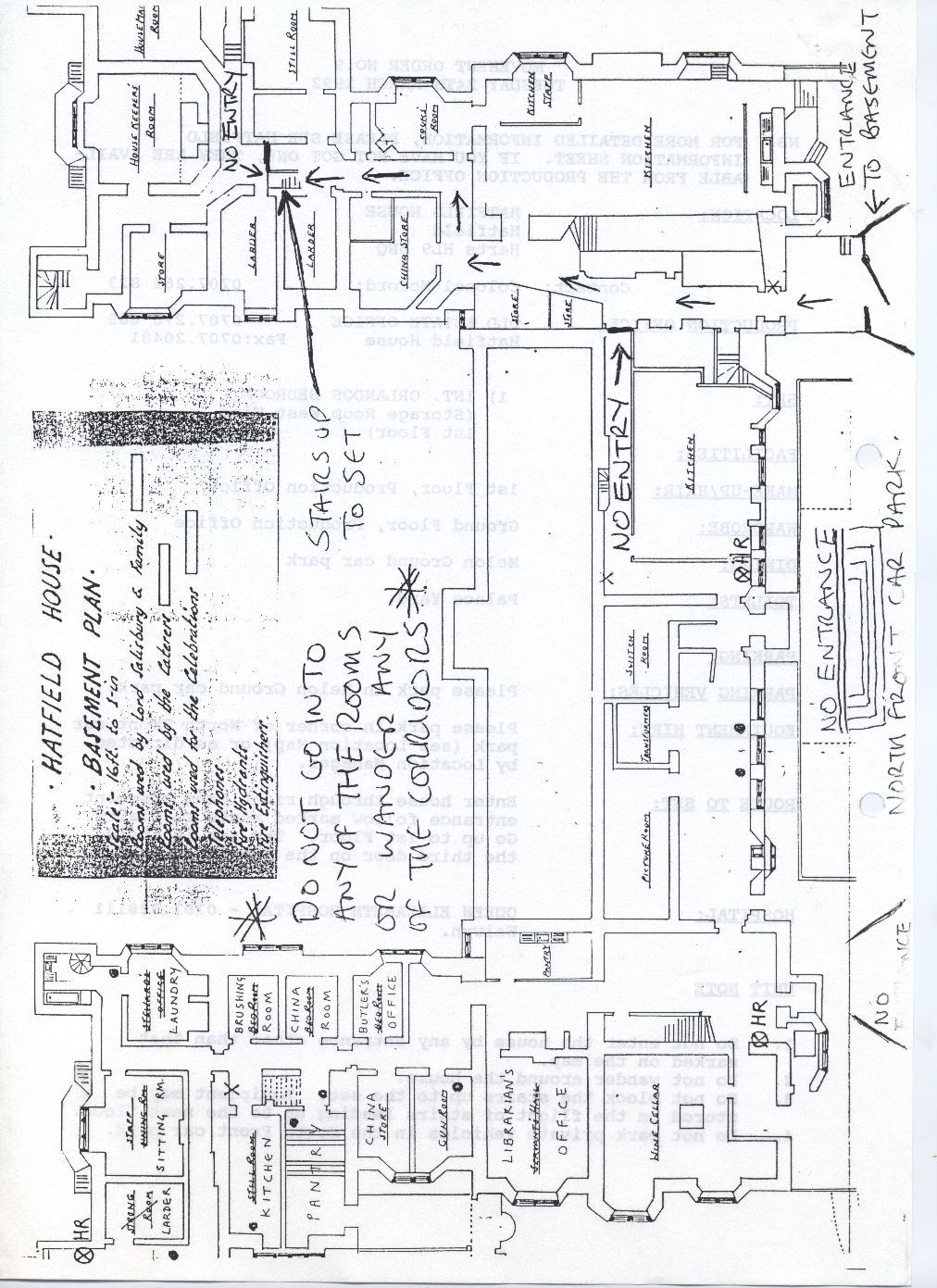Description Reverse of Second Movement Order No.9. Printed map of Hatfield House basement with handwritten annotations. Photocopied A4 sheet.